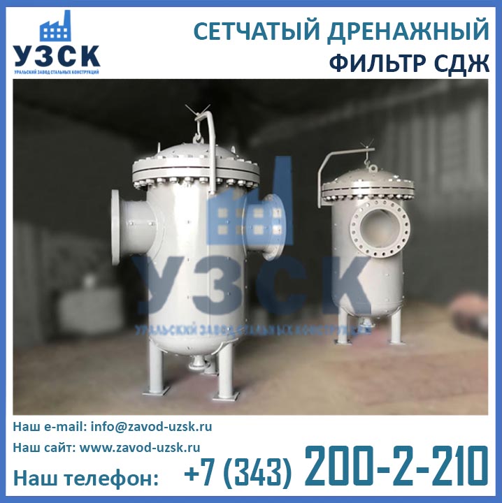 На формирование цены дренажного фильтра влияют следующие факторы: материальное исполнение, конструктивное исполнение, стоимость сырья в момент изготовления, комплектация, необходимость доставки в другой населенный пункт, срочность выполнения работ по изготовлению, прочие предпочтения заказчика. Уральский завод стальных конструкций изготавливает фильтры СДЖ-700 любого типового исполнения, а также нестандартные фильтры СДЖ 700 мм по чертежам заказчика или техническому заданию. Дополнительно к фильтрам СДЖ у нас Вы можете заказать сменные фильтрующие элементы любой тонкости фильтрации, ответные фланцы, прокладки и крепеж. По запросу изготавливаем также фильтры СДЖ-К-700 с концевым затвором. Для того чтобы узнать какова цена на фильтр СДЖ Ду700 в Новосибирске с необходимыми Вам характеристиками, отправьте запрос в отдел продаж завода УЗСК по координатам, указанным в разделе «Контакты».